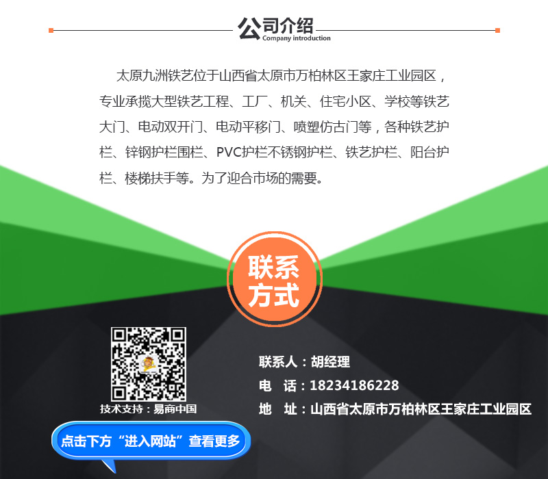 【内容摘要】太原九洲铁艺位于山西省太原市万柏林区王家庄工业园区,专业承揽大型铁艺工程、工厂、机关、住宅小区、学校等铁艺大门、电动双开门、电动平移门、喷塑仿古门等,各种铁艺护栏、锌钢护栏围栏、PVC护栏不锈钢护栏、铁艺护栏、阳台护栏、楼梯扶手等。为了迎合市场的需要。