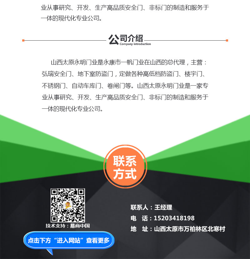 【内容摘要】山西太原永明门业是永康市一帆门业在山西的总代理,主营:弘瑞安全门、地下室防盗门,定做各种高低档防盗门、楼宇门、不锈钢门、自动车库门、卷闸门等。山西太原永明门业是一家专业从事研究、开发、生产高品质安全门、非标门的制造和服务于一体的现代化专业公司。