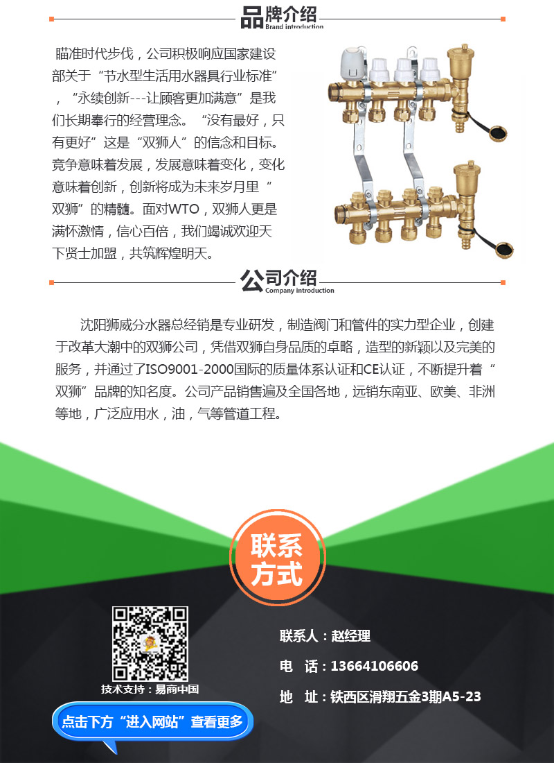 【内容摘要】沈阳狮威分水器总经销是专业研发,制造阀门和管件的实力型企业,创建于改革大潮中的双狮公司,凭借双狮自身品质的卓略,造型的新颖以及完美的服务,并通过了ISO9001-2000国际的质量体系认证和CE认证,不断提升着“双狮”品牌的知名度。公司产品销售遍及全国各地,远销东南亚、欧美、非洲等地,广泛应用水,油,气等管道工程。