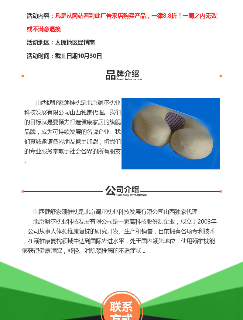 【内容摘要】山西健舒家颈椎枕是北京调尔枕业科技发展有限公司山西独家代理。北京调尔枕业科技发展有限公司是一家高科技股份制企业,成立于2003年,公司从事人体颈椎康复枕的研究开发、生产和销售,目前拥有各项专利技术,在颈椎康复枕领域中达到国际先进水平,处于国内领先地位,使用颈椎枕能够获得健康睡眠,减轻、消除颈椎病的不适症状 。